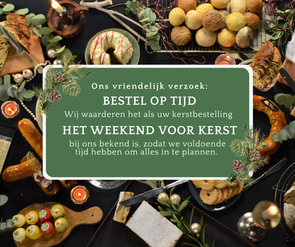 Voor onze bakkers is het elk jaar weer een uitdaging om voor de Kerstdagen alle bestellingen op tijd, maar wel helemaal vers klaar te hebben voor onze klanten. Daarom waarderen wij het heel erg als jouw kerstbestelling op tijd bij ons bekend is, zodat de bakkers alles zo goed mogelijk kunnen inplannen. Bij voorkeur via de webshop en ruim van tevoren. We willen benadrukken dat bestellingen die eerder gedaan zijn niet eerder gebakken worden! Het gaat ons er vooral om dat we voldoende tijd hebben om alles efficiënt in te plannen in de bakkerij en de logistiek. Mocht je toch later bedenken nog iets nodig te hebben, dan is het nog steeds mogelijk om via de webshop te bestellen. (De meeste producten kunnen besteld worden tot uiterlijk maandagavond 23.00 uur.)