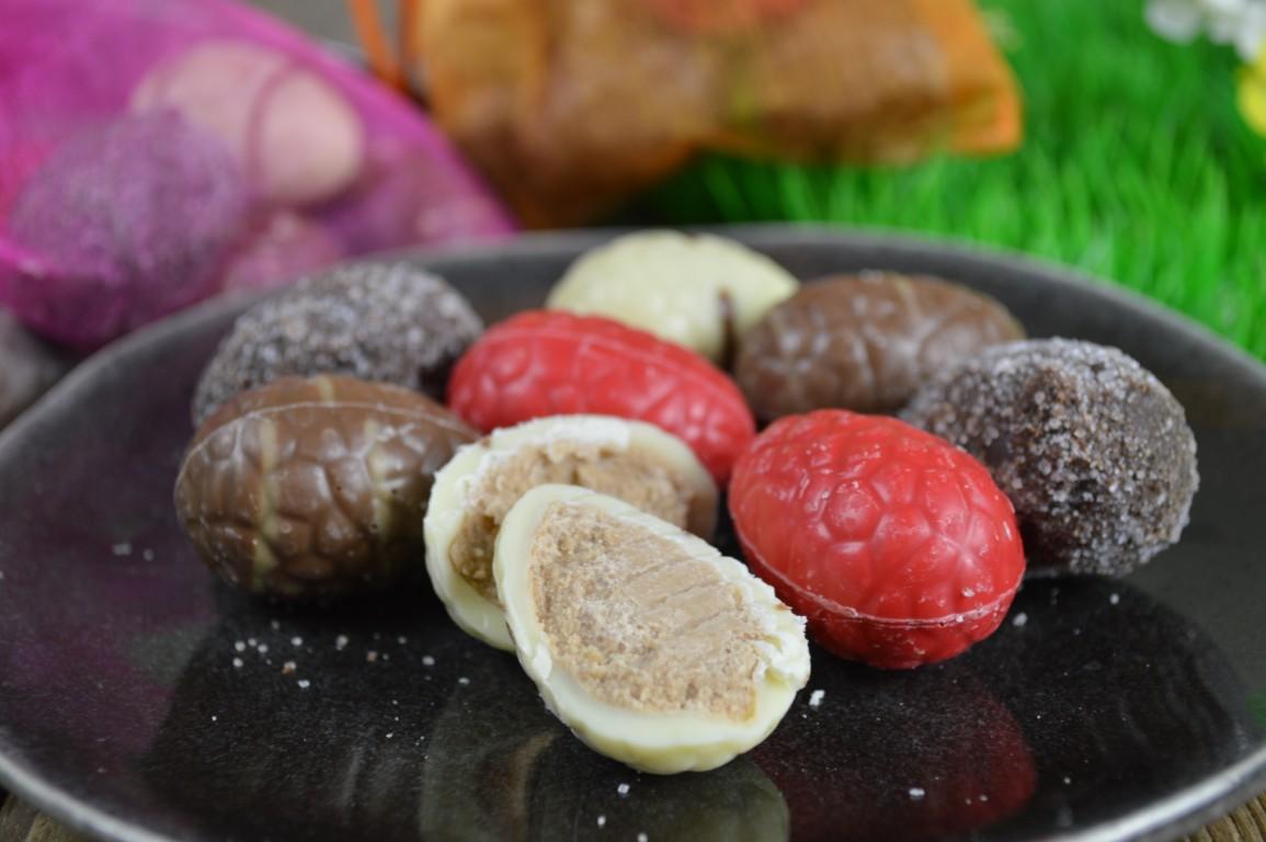 4 verschillende smaken; Melkchocolade met caramelvulling, Witte chocolade (roodgekleurd) met Strawberry Cheesecake vulling, Wit met Amandelvulling en Krokant puur met praliné. Een onmogelijke keuze welke je nu als eerste zal gaan proeven. Maar we kunnen je verzekeren, ze zijn allemaal te lekker!