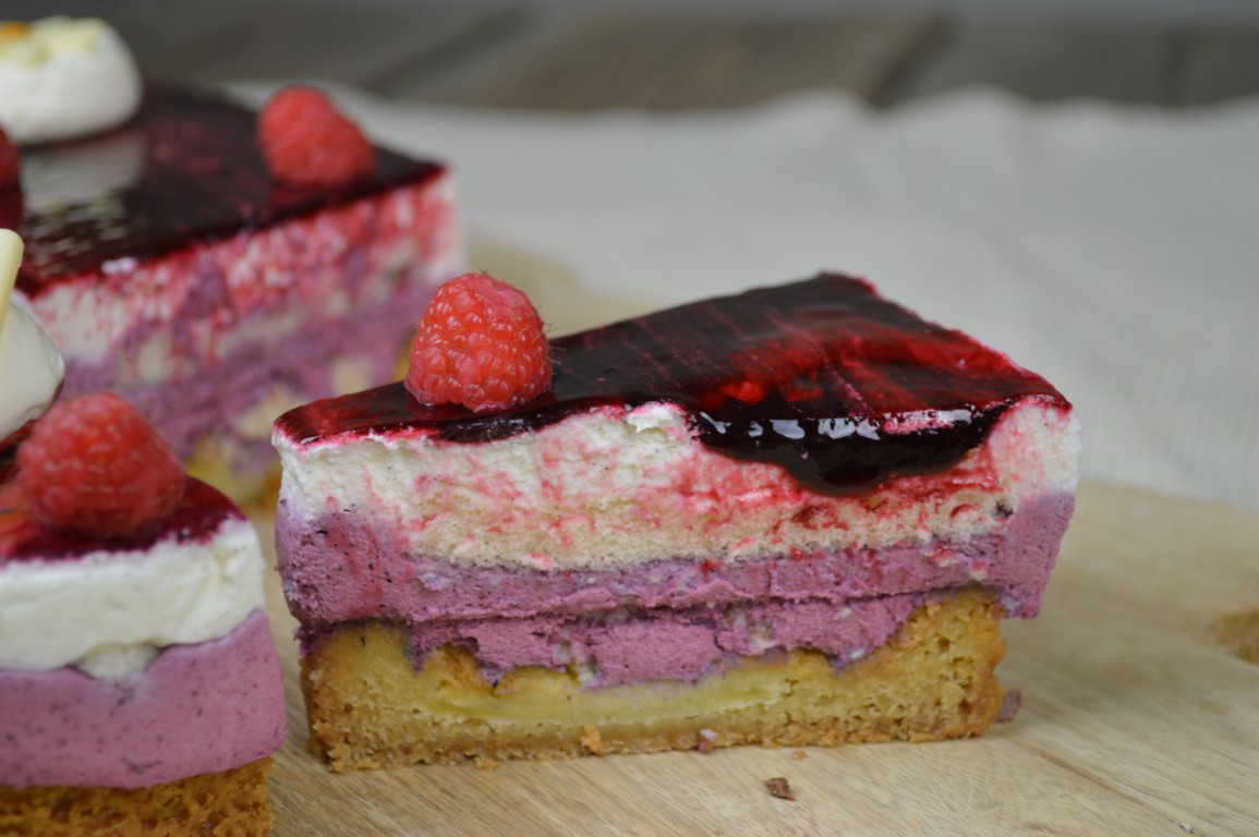 Onze traditionele en inmiddels bekende sloffenbodem met roomboter en meegebakken roomspijs. Daarop een subtiele crunch van witte chocolade met stukjes amandel en obliehoorn. Daarop heerlijk friszoete cassis bavaroise, een dun laagje kapselcake en romige vanillebavaroise met een detail van Malibu.