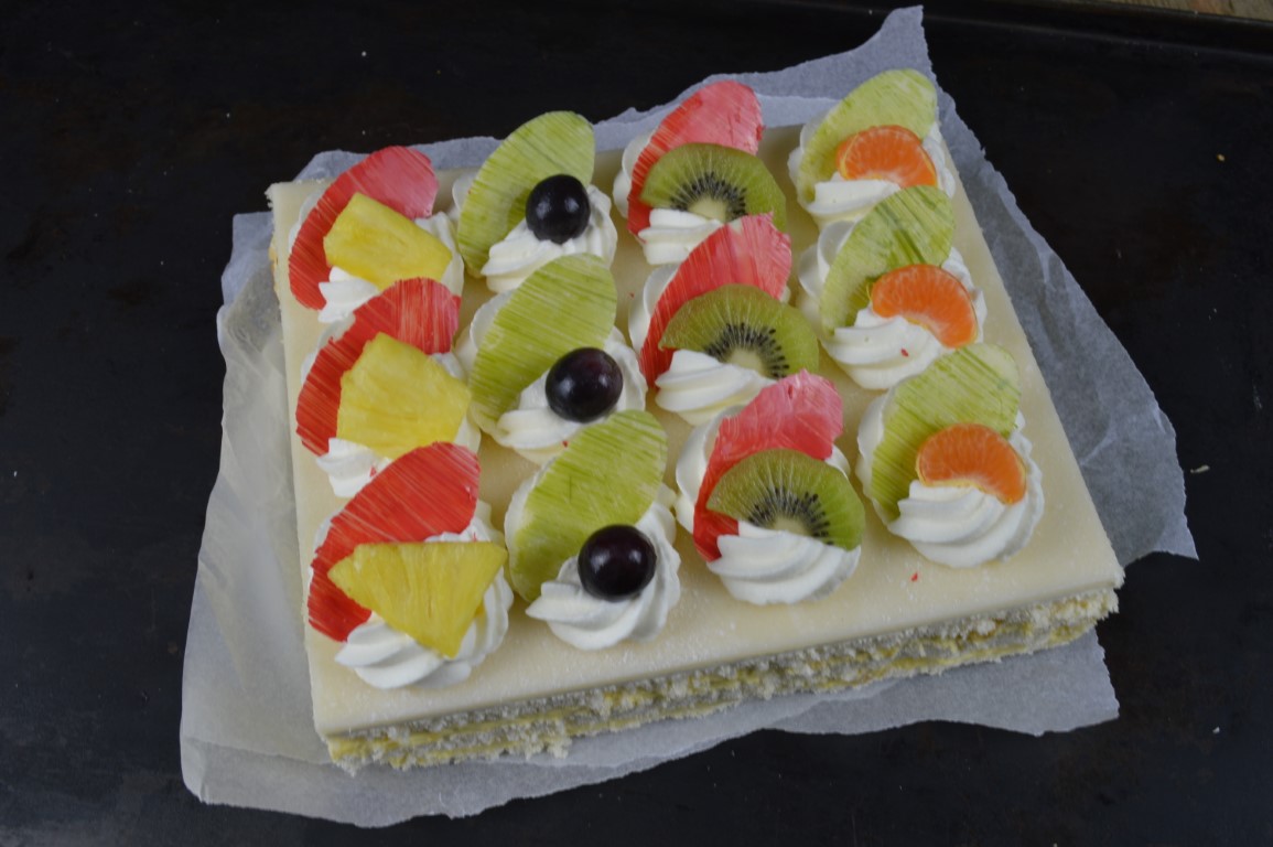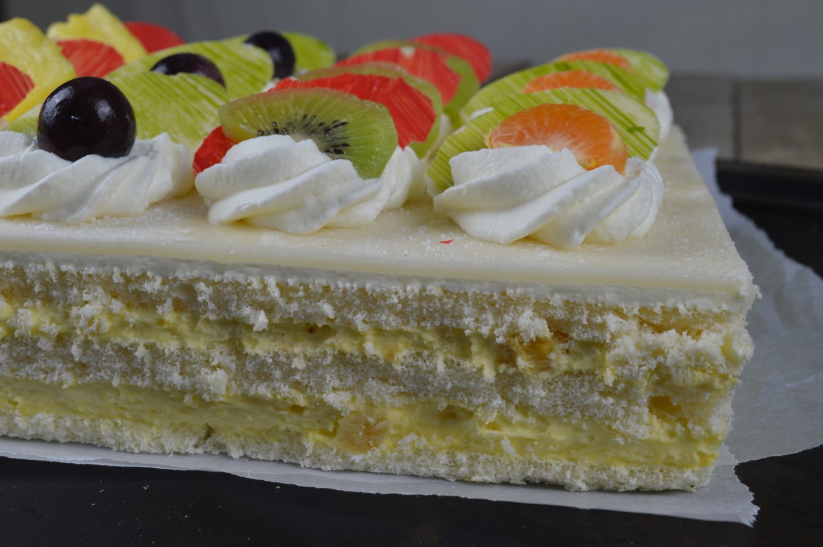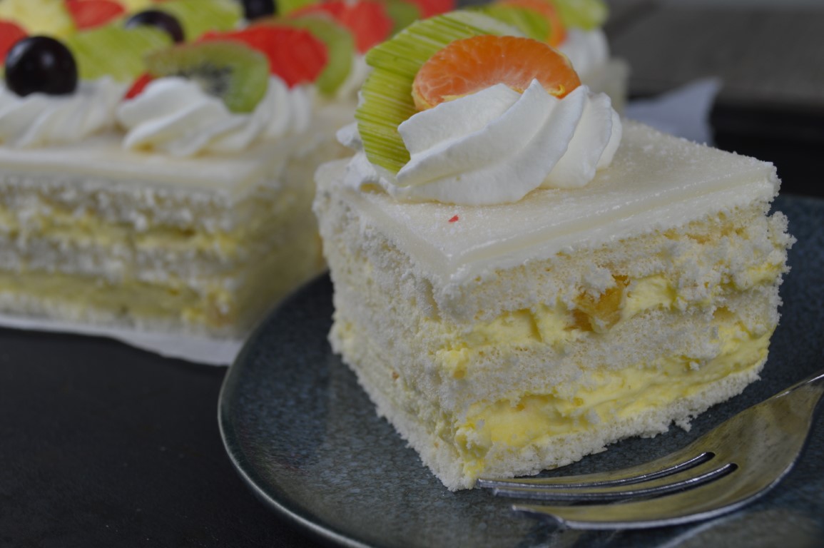 De chipolata taart is gemaakt van een traditionele chipolatavulling van gele room, een vruchtencompote van tropisch fruit, en klein beetje rum en een detail van bitterkoekjes tussen drie laagjes kapsel cake. Dit resulteert in één van onze specialiteiten op het gebied van banket. De chipolata taart wordt afgewerkt met een laagje smakelijke marsepein en rozetjes slagroom. En natuurlijk maken we het compleet met heerlijk vers fruit op de taart.