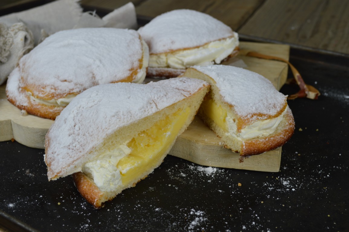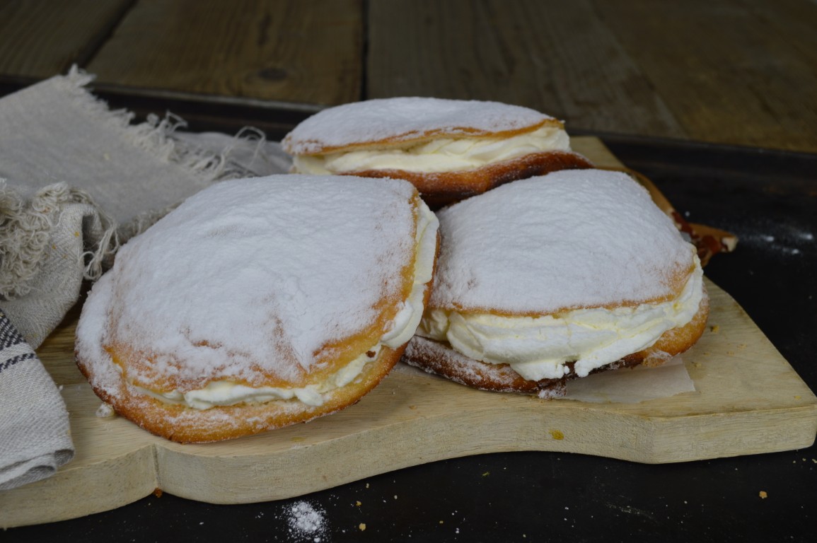Een heerlijke zachte eierkoek, vol gespoten met een combi van gekookte pudding en luchtige slagroom. Bestrooid met poedersuiker. Juist deze combinatie is zo lekker! Het blijft een eierkoek, maar smaakt als een gebakje.