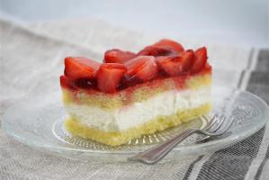 Het gluten en lactose vrije aardbeien cheesecake gebakje is gemaakt van twee lagen glutenvrije cake. Met rijstmeel, lactose-vrije crème en afgewerkt met frisse aardbeien.