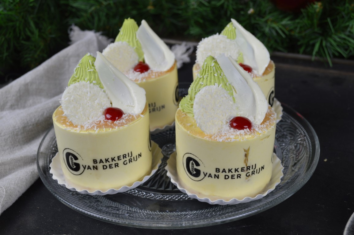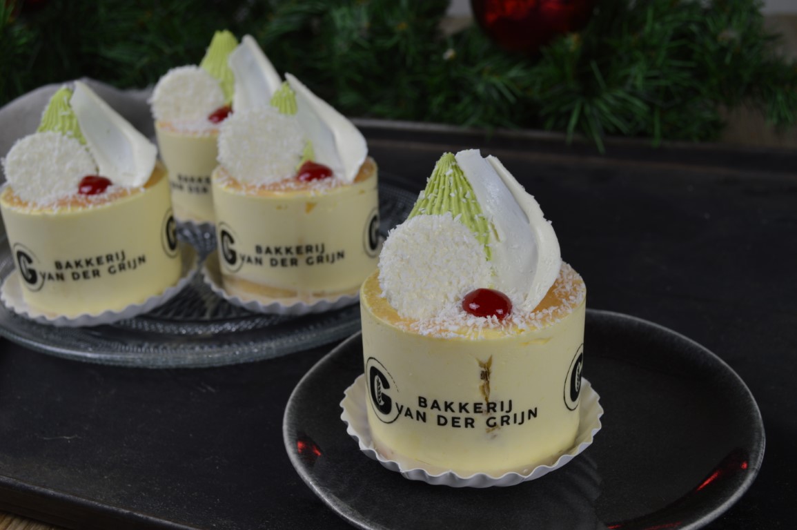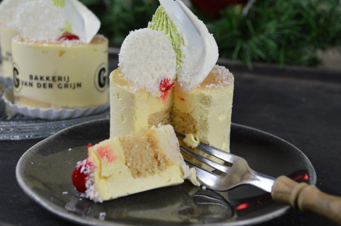 Een cruncy bodem van hard witte chocolade. binnenin een plakje luchtige kapselcake en smakelijke sticky toffee cake. Daarop heerlijk romige mango bavaroise met een detail van passievrucht likeur. Prachtig opgemaakt in kerstsfeer met een royale cremetoef, een chocoladedetail en een strooiseltje kokos.