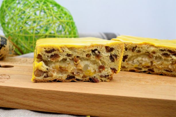Een specialiteit van bakkerij van der Grijn: heerlijk rozijnenbrood met de beste Turkse rozijnen en gevuld met de allerlekkerste ingrediënten. Wat dacht je van: amandelspijs, appel, kaneelsuiker, perzik, peer en een detail van gebrande nootjes afgewerkt met abrikozen jam. Prachtig afgewerkt met een heerlijk zachte, zoete fondant laag. Dat klinkt toch verrukkelijk! Voor het paasontbijt, de brunch of voor bij de koffie.