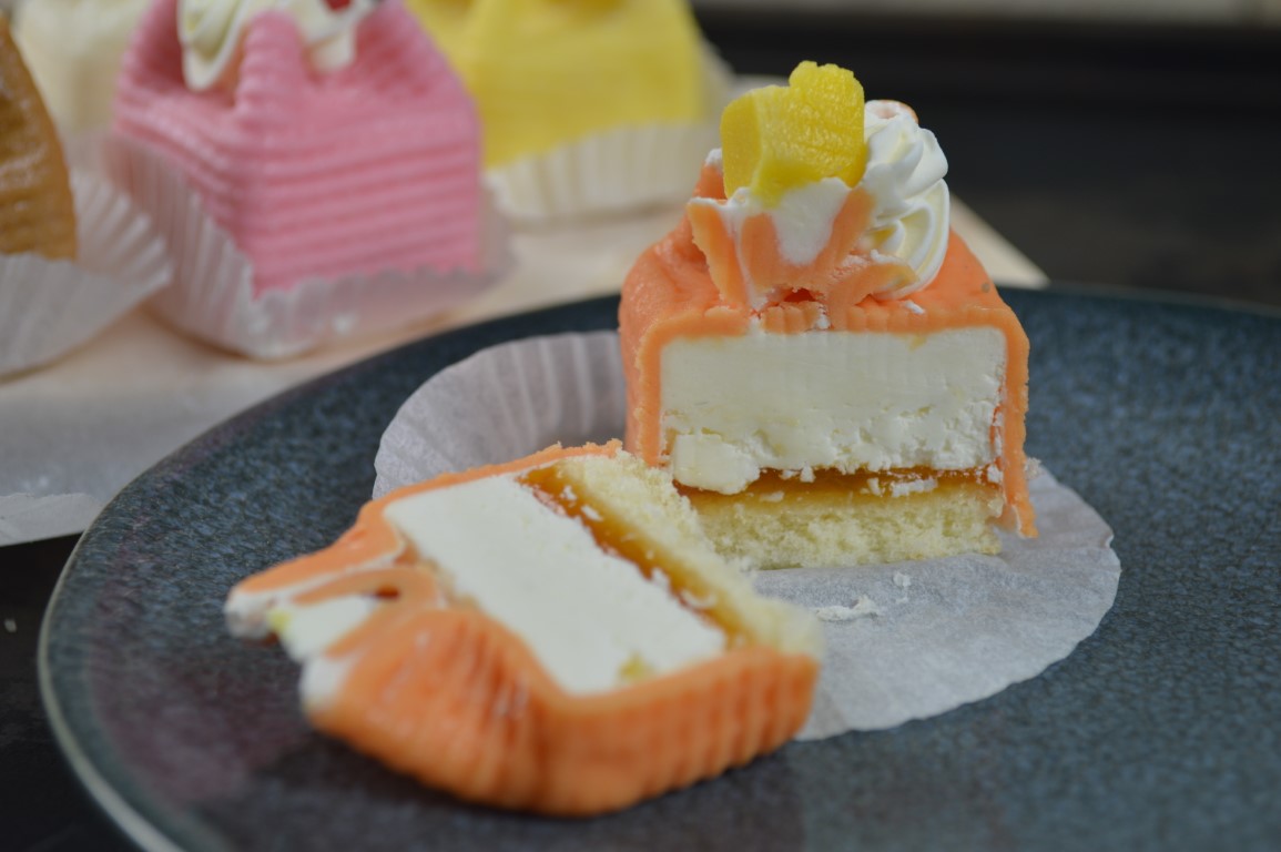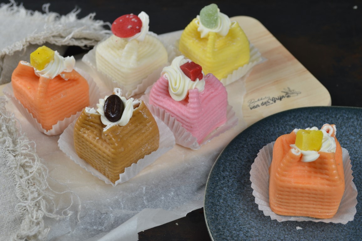 Onwijs leuke en lekkere mini gebakjes, deze kasteeltjes zien er niet alleen heel gezellig uit, maar ook heerlijk verfijnd van smaak. Lekkere cake met een laagje jam en botercremé. Verpakt in een jasje van zoete marsepein in verschillende kleuren.