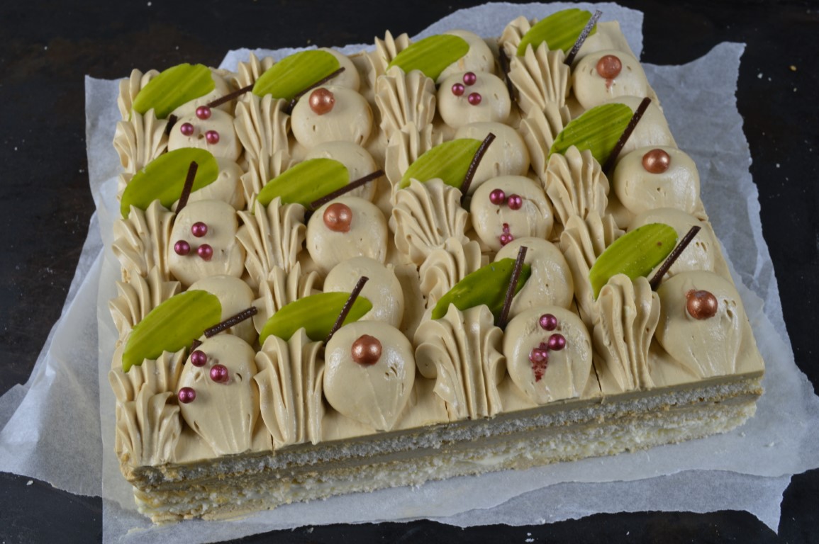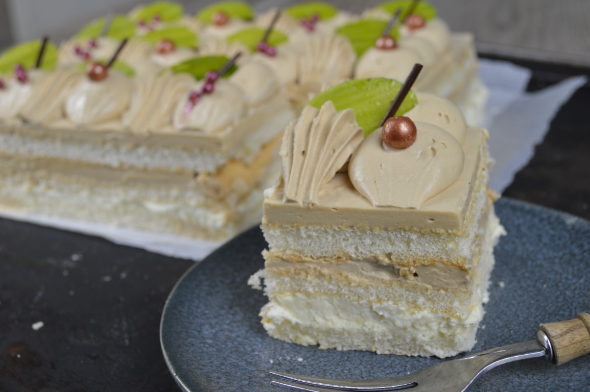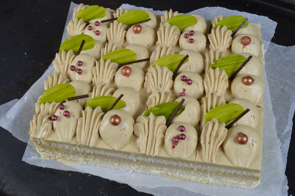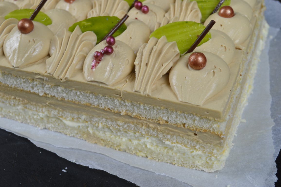 Onze moccataart bestaat uit laagjes zachte kapselcake gevuld met een laag smakelijke kookroom en een laag boterzachte moccacreme. Royaal bespoten met mooie toeven moccacreme. Feestelijk afgewerkt met zelfgemaakte chocolaatjes.