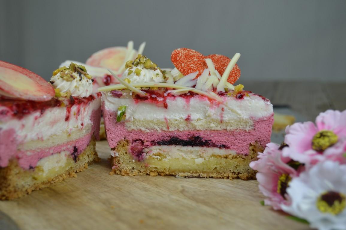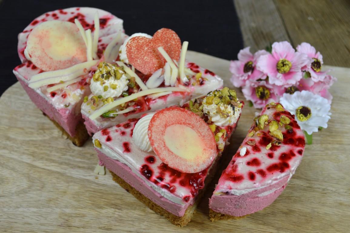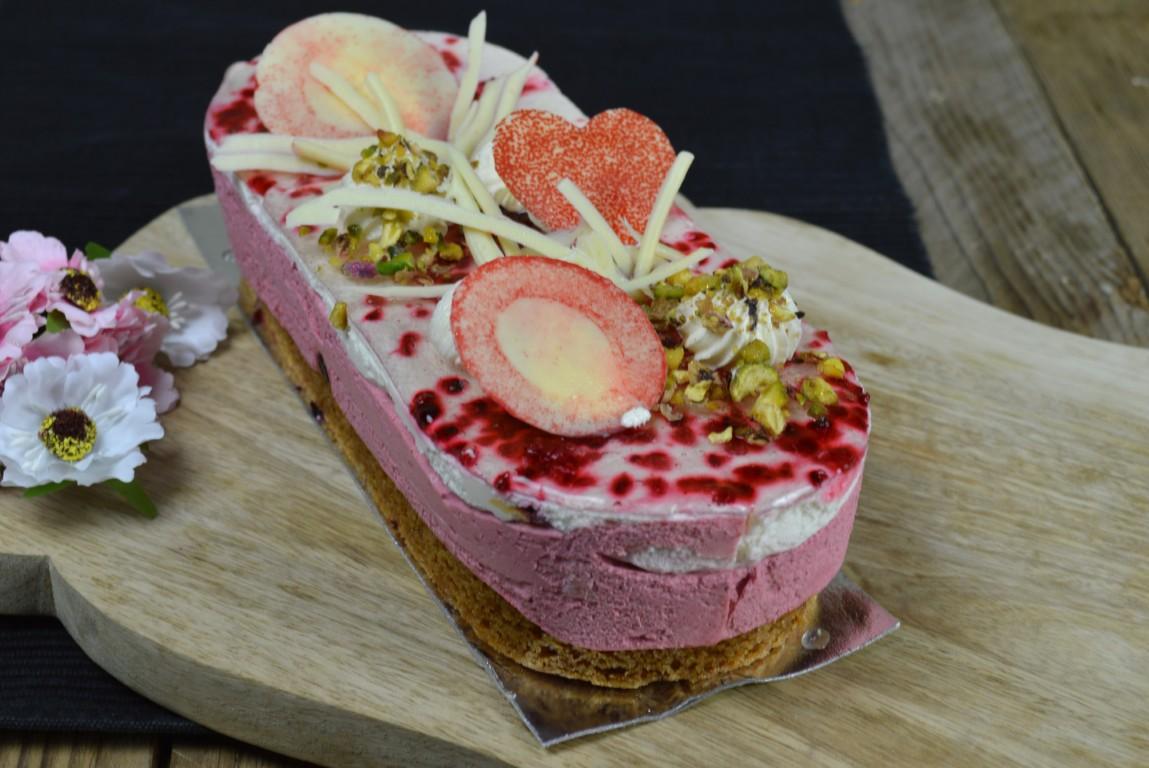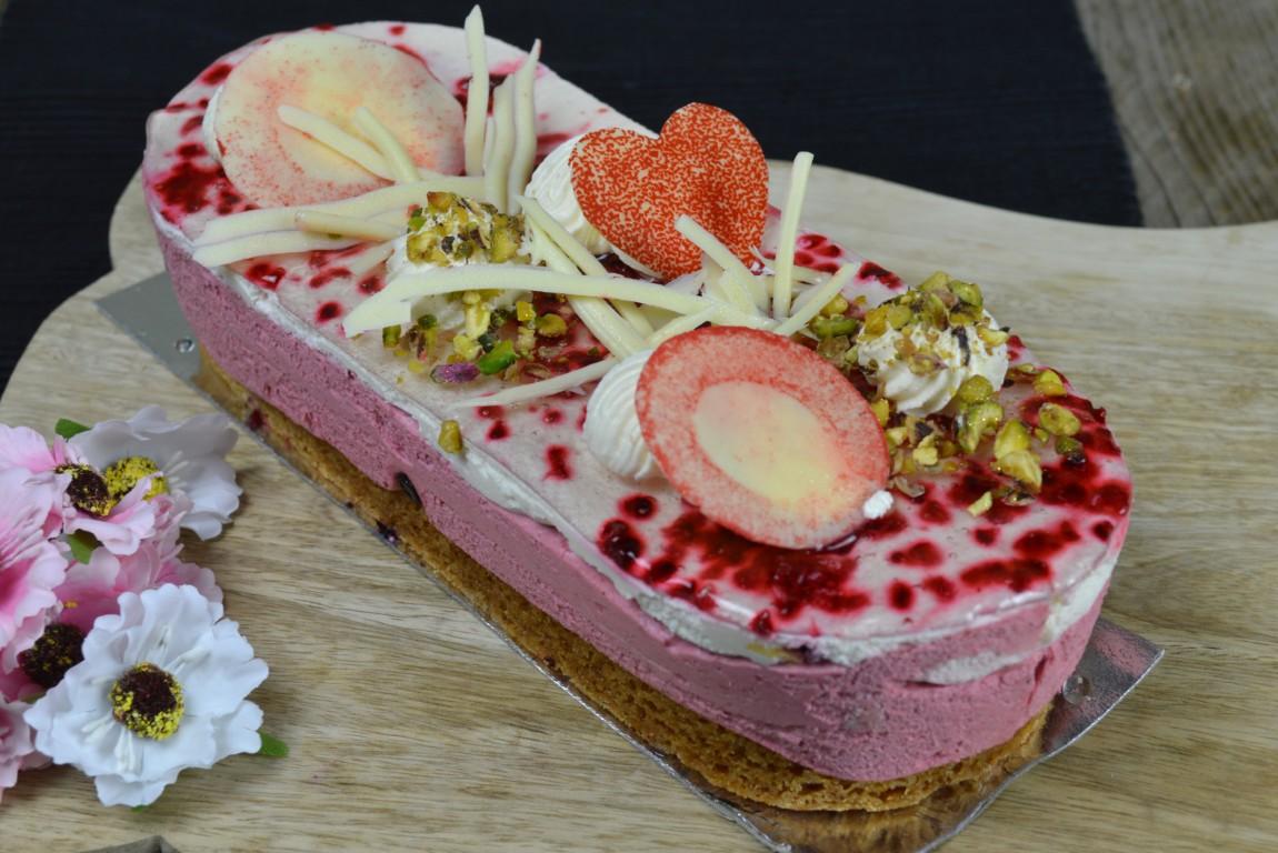 Deze Moederdagslof is een topper van onze banketbakkers, gemaakt op onze allerlekkerste sloffenbodem van roomboterdeeg met meegebakken roomspijs. Daarop een vulling van heerlijke romige frambozenbavaroise. Binnenin is nog een een laagje luchtige kapselcake verpakt, samen met een smakelijk knisperend laagje van witte chocolade en fijngemalen nootjes. Een combinatie van traditionele maar o zo geliefde smaken.. Opgemaakt in lieve moederdagsfeer met lekkere chocolaatjes en subtiel wat gehakte pistachenootjes.