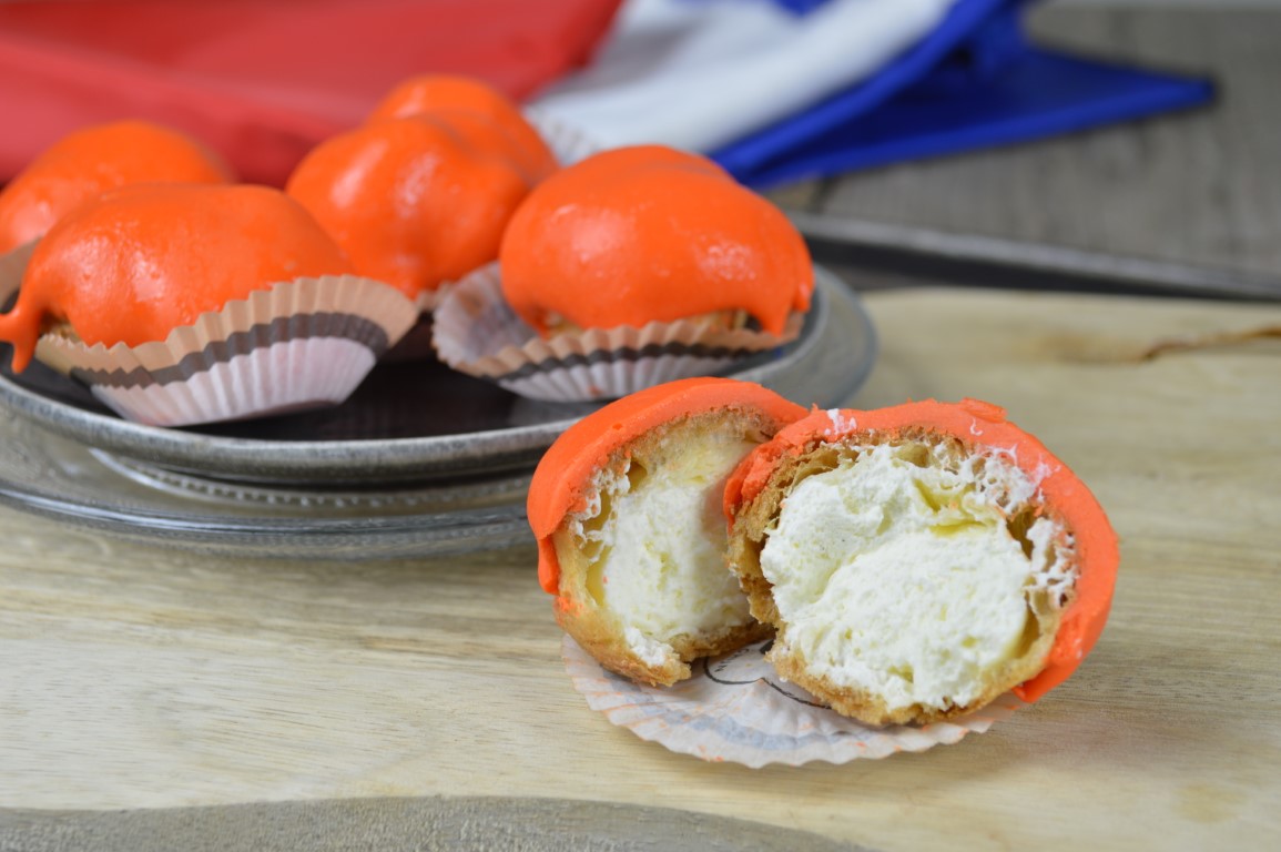 Geen koningsdag zonder traditioneel oranje gebak. Maar vind je de oranje chocoladebollen te groot? Kies dan voor deze mini chocolade bolletjes. Luchtig soesje gevuld met slagroom. Gedipt in oranje gekleurde witte chocolade.