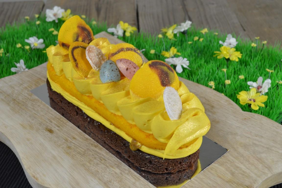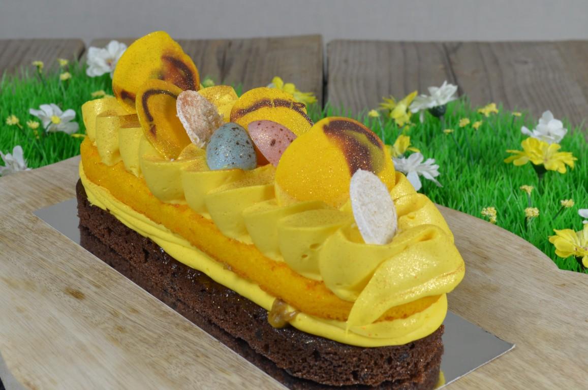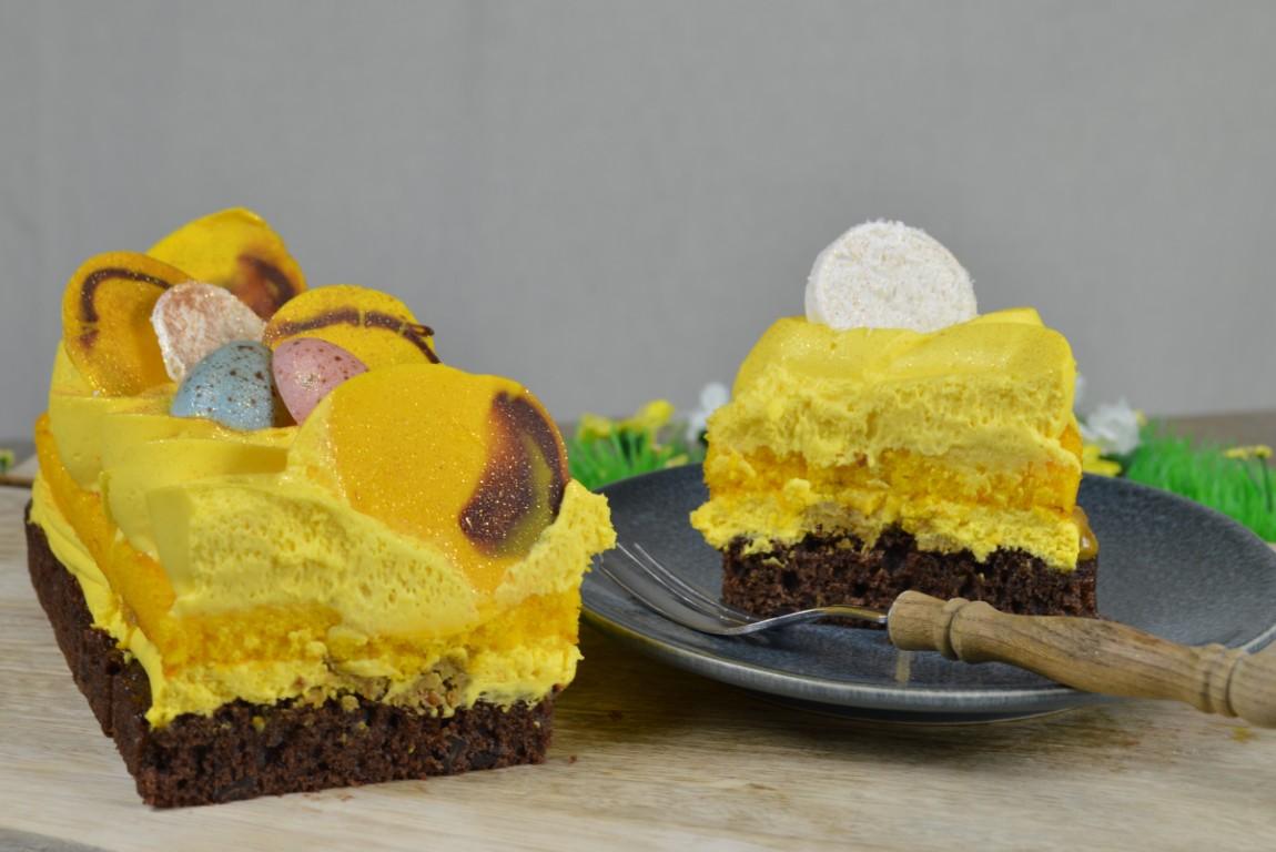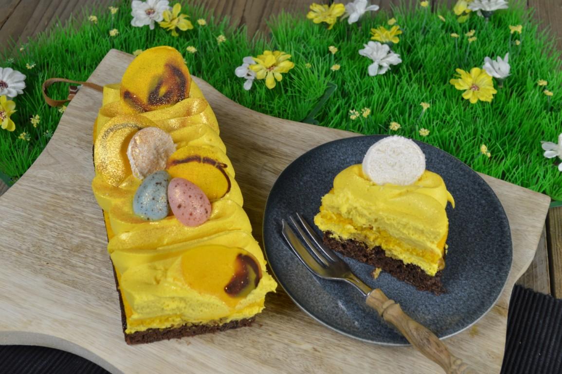 Tussen de ganache lagen prijkt een plakje zachtzoete cake. De opmaak is in vrolijke paassfeer met verschillende chocolade details.