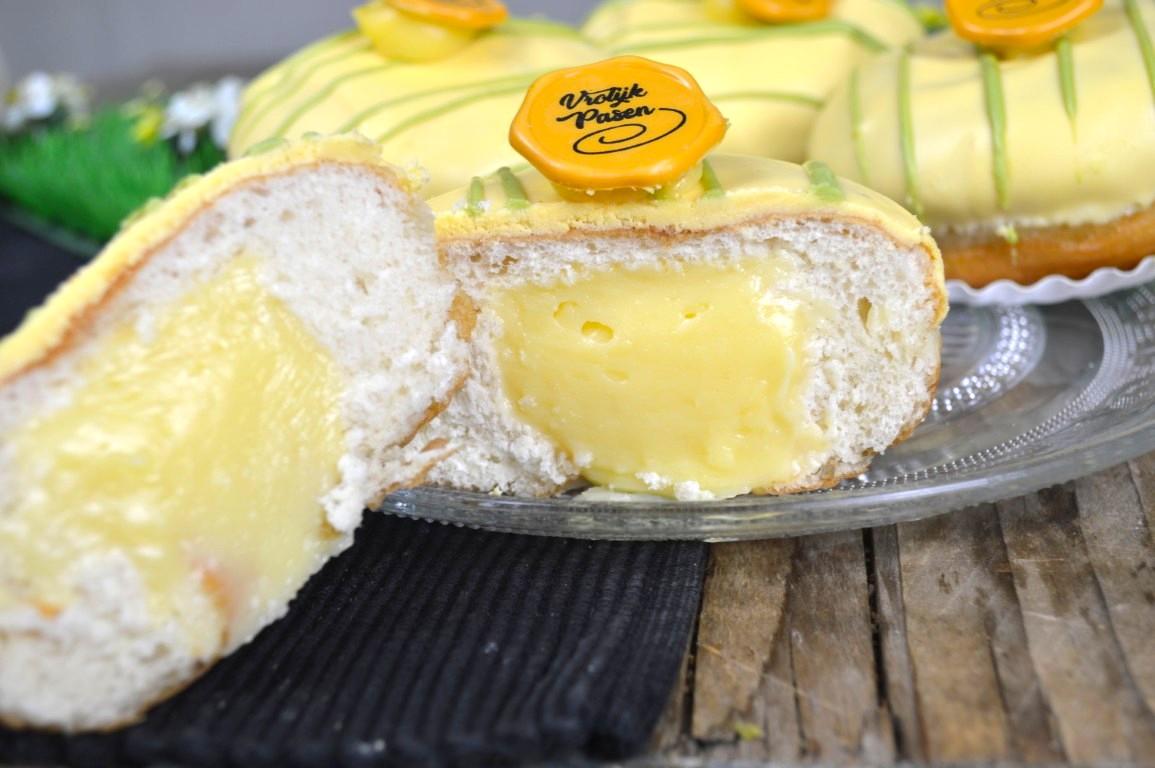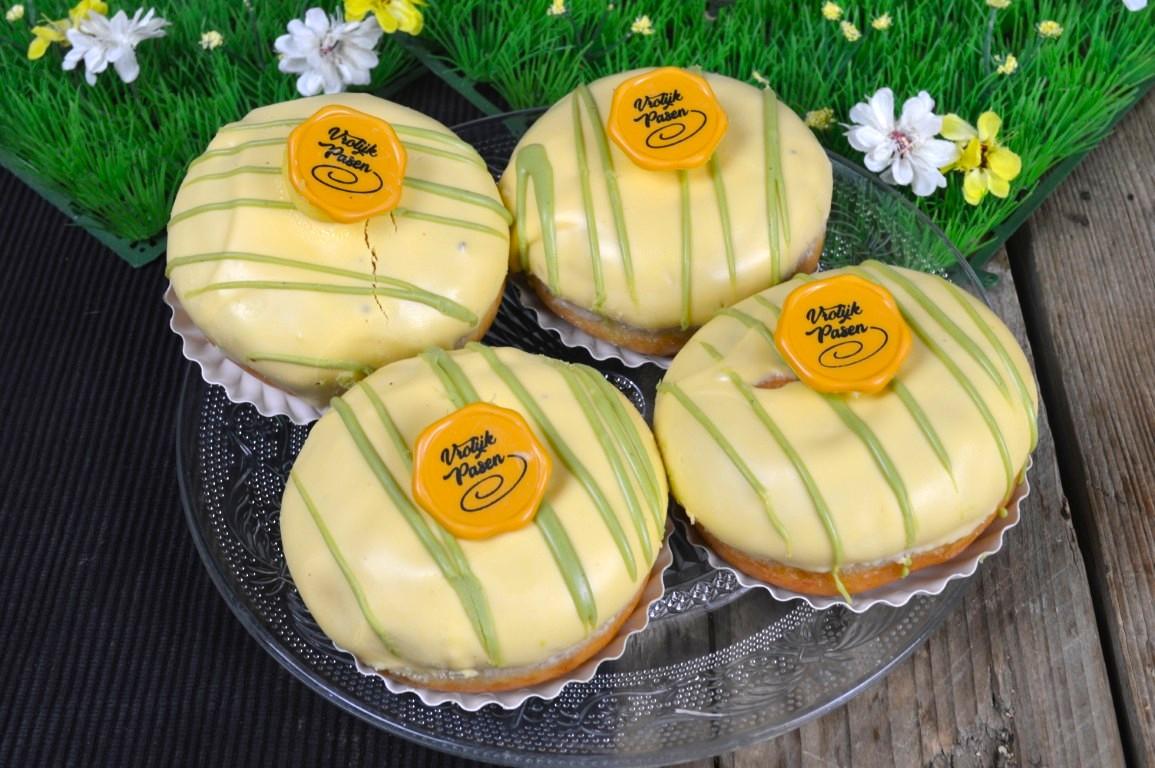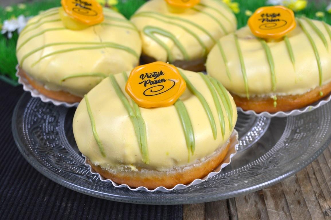 Licht gefrituurd zoet deeggebak, royaal gevuld met luchtig gekookte vanille pudding. Omhuld met zachte zoete witte chocolade, opgemaakt in paasstijl.