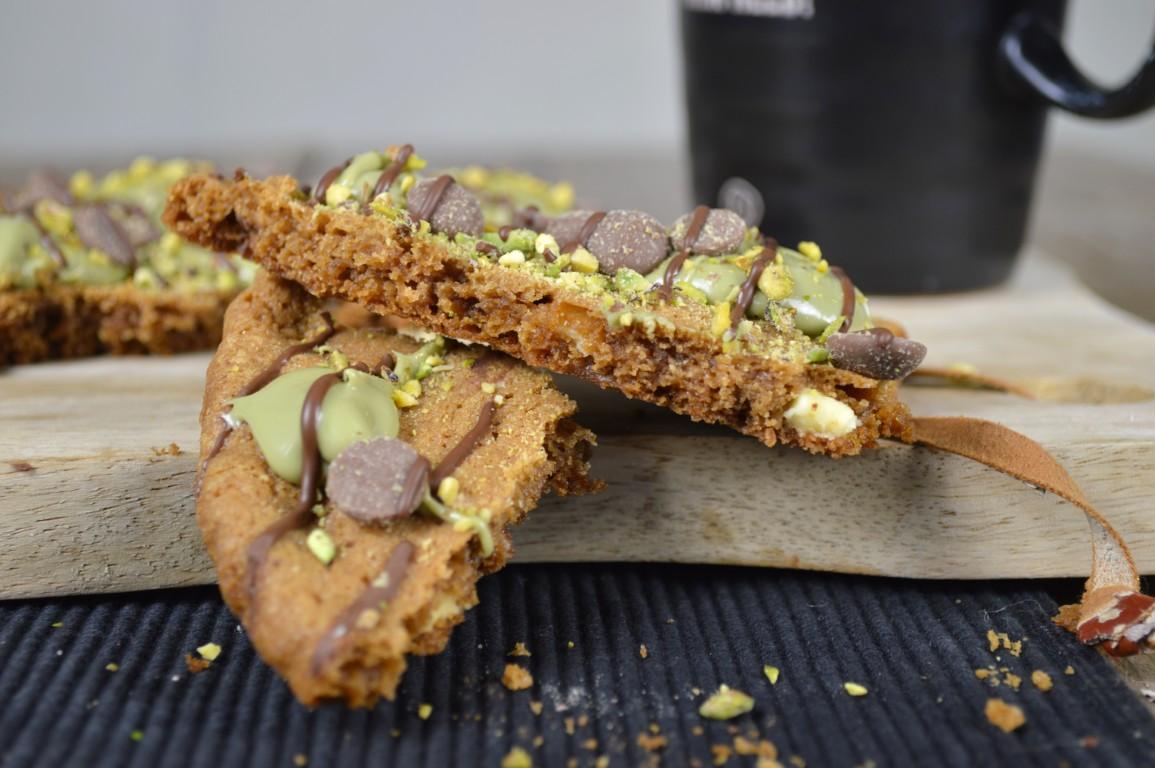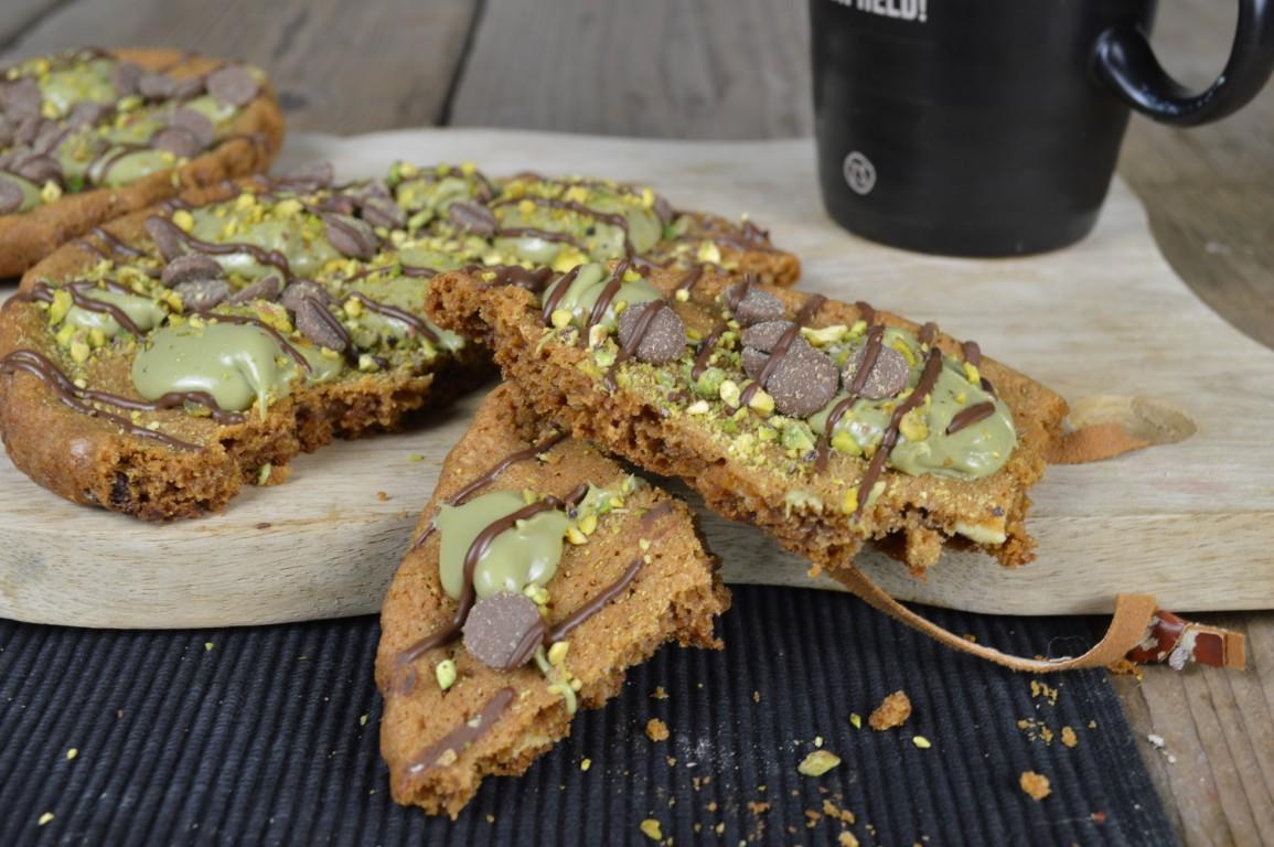 Nieuw en onweerstaanbaar! Royale koek om met elkaar te delen! Smakelijke cookie voor 4 tot 5 personen, zacht van binnen met een krokant randje eromheen. Met aantrekkelijke meegebakken stukjes witte en pure chocolade. De koek is opgespoten met een heerlijk smeuïge pistache créme en afgewerkt met stukjes pistachenoot en melkchocolade.