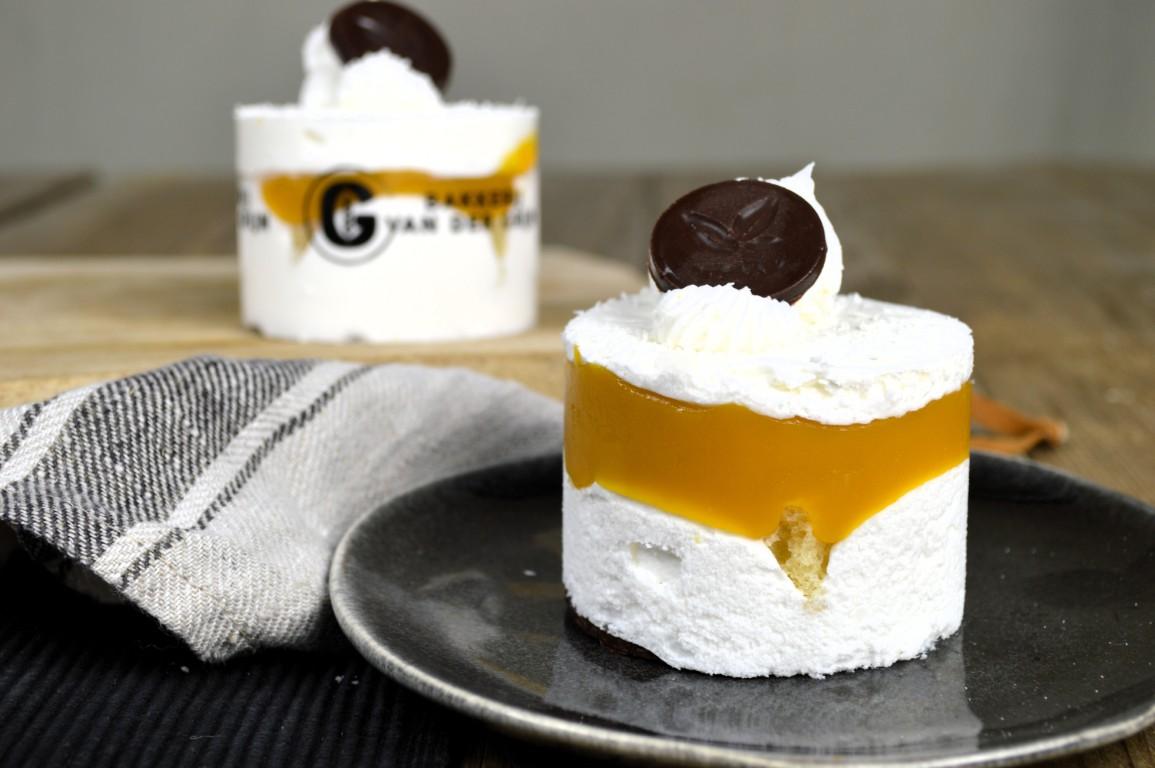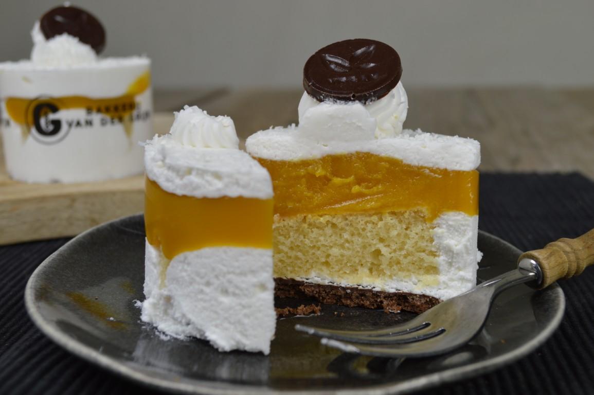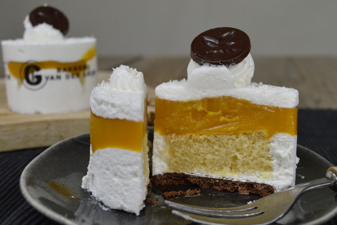 Bodem is een lekker krokante koek met daarop smaakvolle cake en een mango fruitvulling met passievrucht. Daarbij een royale laag luchtige plantaardige room en een detail van kokos. Door de mooi opgespoten toeven en het strooiseltje van kokos ziet het gebakje er extra aantrekkelijk uit.