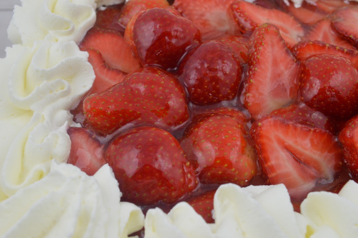 Een heerlijke taart voor 12 personen met enorm veel, verse aardbeien! De taart bestaat uit drie laagjes kapselcake met daartussen slagroom. Op de bovenste laag heerlijk afgewerkt met aardbei bavarois. De bavarois is gemaakt op basis van verse aardbeiden. Aardbeien, aardbeien en nog eens aardbeien! Proef de zomer, mmm!