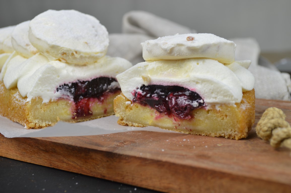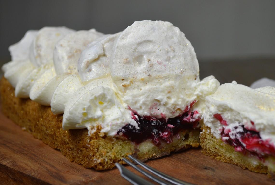 Een smakelijke bodem van wenerdeeg met een laagje meegebakken roomspijs (amandelspijs gemend met gele room).