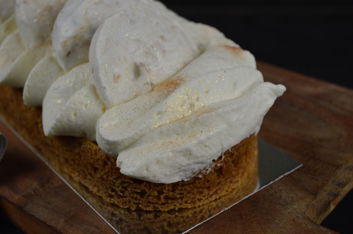Daarop een friszoete kersencompote en romige slagroom. Afgewerkt met lekker zoete hazelnoot schuimplakjes en een subtiele eetbare goudspray.