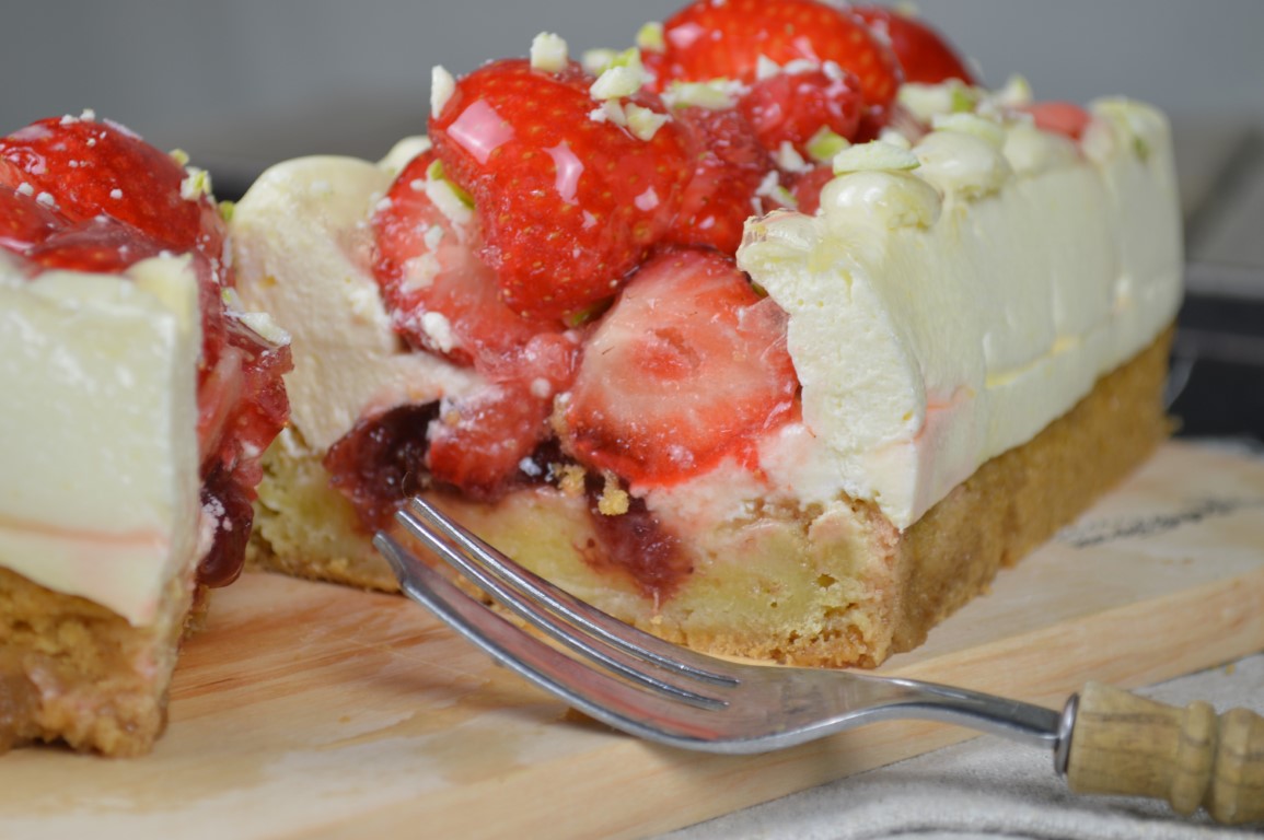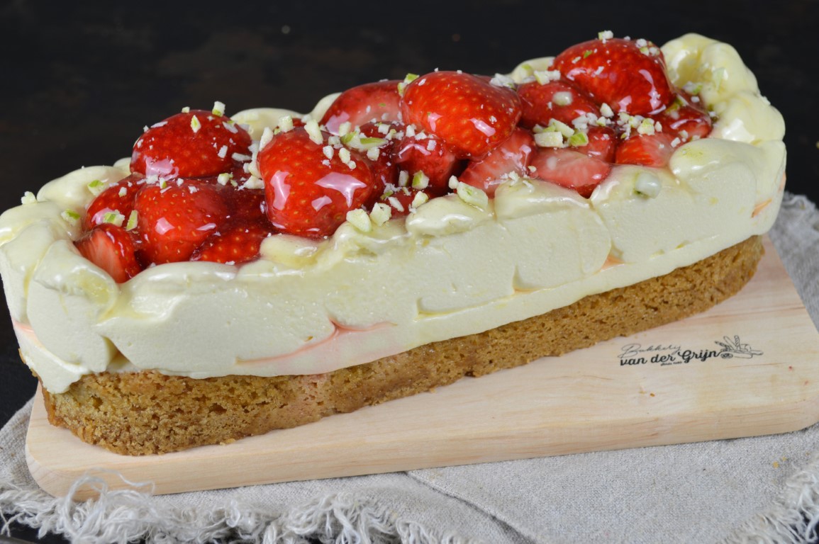 Hiermee komen we de zomer wel door! Verrukkelijke slof van een wener sloffen bodem met een subtiel laagje meegebakken roomspijs. Daarop een vulling van zoete aardbeienmoes, en een frisse bavaroise met lichte sinaasappelsmaak en een drupje likeur 43. De verse aardbeien erop maken het compleet. Bij elkaar een friszoete combinatie.